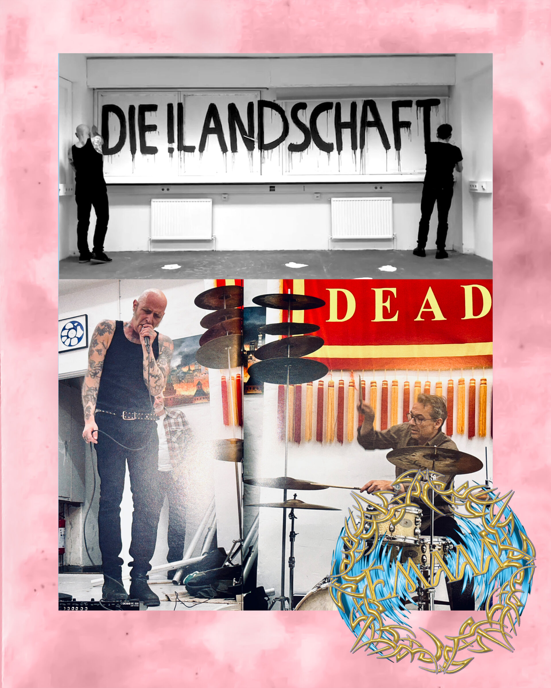 Das Musikduo DIE!LANDSCHAFT schafft spontane Kompositionen für Stimme und Schlagzeug. Sie definiert sich durch Präsenz unf Negation: no words, no songs, no Rock’n’Roll. Seit über zehn Jahren schaffen die Künstler Manfred Peckl (Stimmen) und Andreas Schlaegel (Schlagzeug) einen hochdynamischen musikalischen Austausch, der sich zu komplexen und chaotischen Klangkaskaden schichtet. Inspiration schöpfen sie aus unterschiedlichsten Quellen, von Free-Jazz zu Punk, von archaischen Klageliedern zu Schreiwettbewerben, von Protestgesängen zu halb vergessenen Kinderreimen, das Ergebnis ist offen. DIE!LANDSCHAFT ist, was ist.